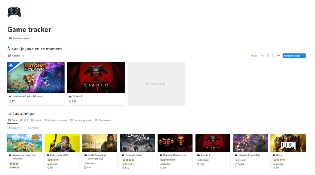 A database of games, which allows you to link them to a console, sort them by console, rating, finished or not, indicate which ones you have platinumed and what you are currently playing.